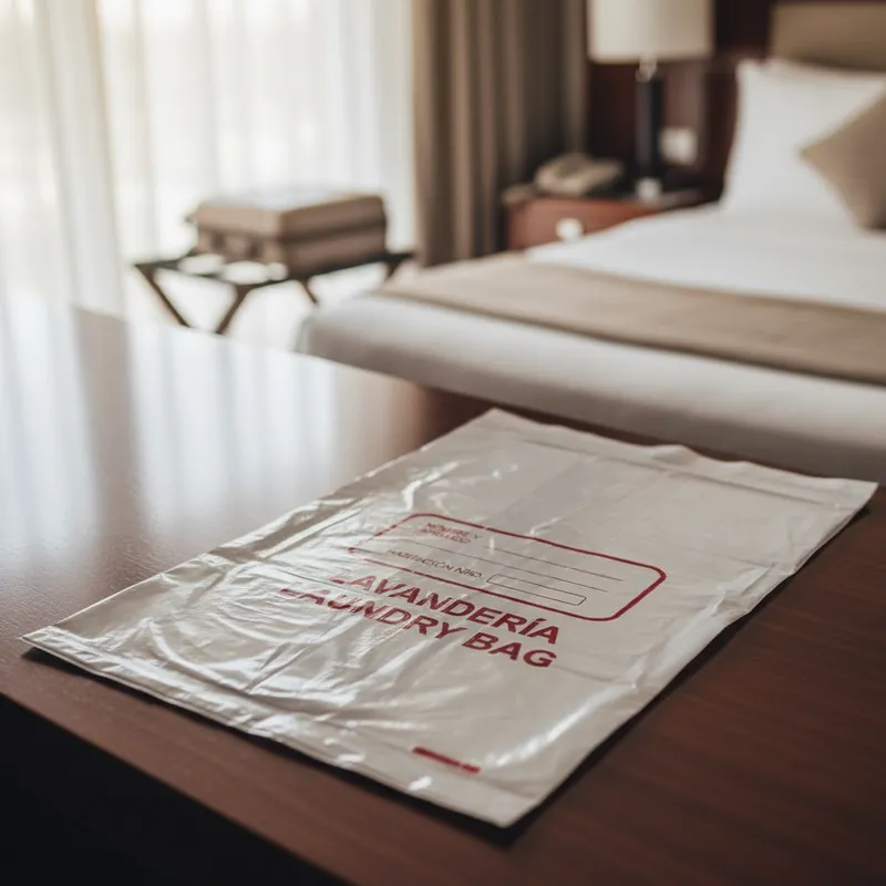 Bolsa para toalla de 40 por 50 cm. / 30 micrones. Fondo blanco. La personalización del producto lo identifica con el establecimiento y le otorga un valor agregado a la estadía del huésped.