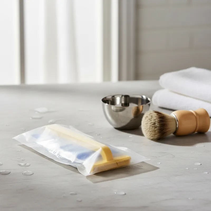 Kit de afeitar personalizado con sticker full color, envasado en estuche de cartón laqueado UV. Incluye 1 maquina de afeitar y un gel afeitado